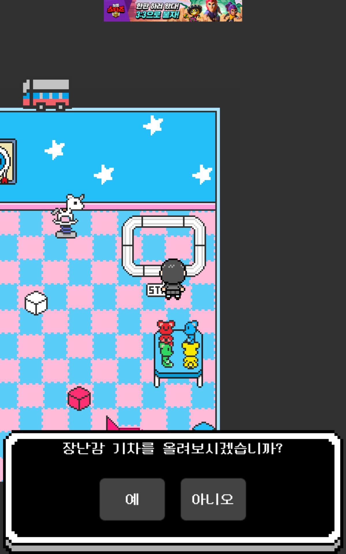 일단 이건 위쪽의 놀이방 타일 힌트입니다. 색을 맞춰주고 왼쪽방에 가보면 바닥이 올라와있고 장난감기차가 있습니다.