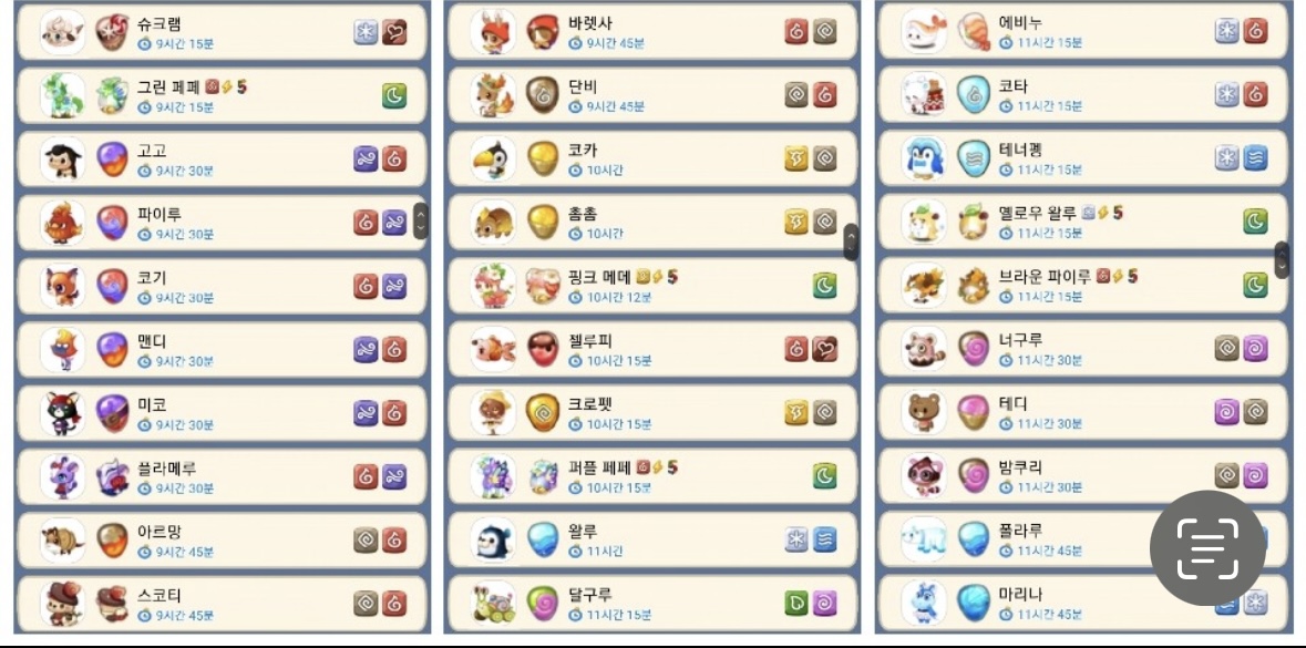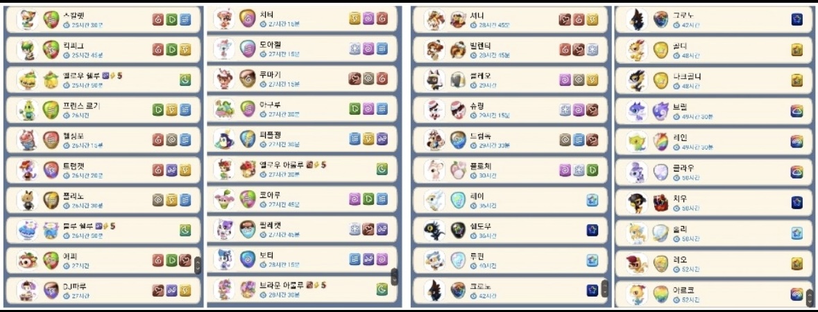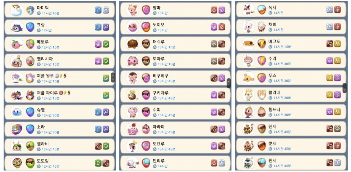 | 레이, 쉐도우 (36h) | 물 또는 바람 속성 포함 4속성 이상 레어 미포함 근본 조합 : 페페+푸푸 조합 시간대가 오전 9시~오후 9시 사이일 경우 레이, 오후 9시~오전 9시 사이일 경우 쉐도우 |